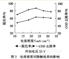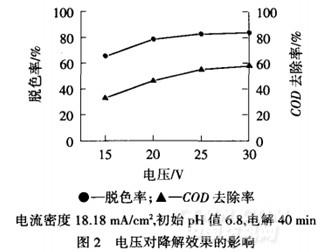 由图2可见,在相同的电压、电流密度下,三维电极法对印染废水脱色率明显高于对COD的去除率.随着外加电压的增大,COD去除率和脱色率均得到提高.原因是随着外加电压的增大,粒子电极的复极化程度提高,电化学反应的动力增加.超过25v后,继续增大外压对提高COD去除率及脱色率的效果不明显,此时反应器中会产生大量气泡,该现象随外加电压超过30V后而加剧.因为随着电压的进一步增大,活性炭炭粒表面上的水解加剧,使污染物在炭粒上不能很好地吸附而通过电解去除,甚至出现其他副反应,如2H2O→4H++O2+4e[9],从而导致废水COD和脱色率难以继续提高.同时,随槽电压增大,耗电量迅速增加.因此,外加电压以25V为宜.