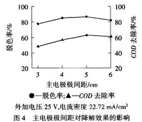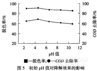 由图5可见,酸性条件下的降解效果好于碱性条件.4.5<pH值<10.7时,脱色率和COD去除率随溶液初始pH值的降低而逐步上升;在pH值为4.5时达到最高;pH值<4.5,脱色率和COD去除率则随pH值降低而下降.原因是在阳极上发生有机物氧化降解的同时还存在阳极上析氧的竞争反应.在酸性环境中析氧电位较高,较难发生析氧反应;而在碱性环境中析氧电位较低,较容易发生析氧反应.而且在酸性条件下·OH有更强的氧化性,有机物更容易被氧化.但pH值过低,则有利于H+在阴极板和粒子电极表面还原成H,减少了H:0生成量,从而减少了·OH的生成量.[14]因此,水样的初始pH值调节在4.5为佳.
