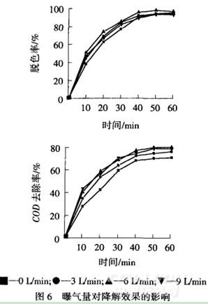 在电解过程中,空气由增氧泵从反应器底部多孔进气管通人并经布气板分布进入电解槽,使反应从固一液两相拓展到气一固一液三相,使体系成为三相三维体系.通人空气除了补充在反应过程中不断消耗的氧外还起搅拌作用,提高传质速度.曝气量对降解效果的影响见图6.