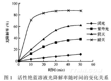 为考察不同光照条件下活性艳蓝的光降解效果,配制相同组成的活性艳蓝溶液,分别测定在波长为365 nm的6 W紫外灯、晴天日光照射、阴天散射光和闭光条件下活性艳蓝溶液的光降解率随时间的变化情况。光降解实验条件为草酸0.6 mmol/L、硝酸铁(以Fe3+计)0.2 mmol/L、H2O2150 mg/L、活性艳蓝60 mg/L和pH值3.0,结果如图1所示。