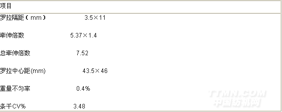 天丝纤维棉卷粘卷现象比较严重,为了解决这一问题,将生产不正常的天丝棉卷直接拿到梳棉纺成棉条,再把棉条纺成粗纱,虽然粗纱各项指标很差,但可以用来隔离天丝棉卷。棉卷通过夹粗纱后,粘卷现象有了明显的好转。由于天丝纤维表面滑爽、抱合力差、易伸长,为此增加了棉卷罗拉加压,以增强纤维之间的抱合力,使棉卷能够顺利成型。
