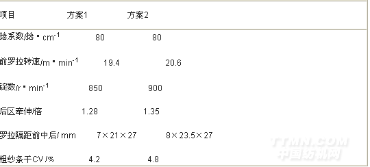 减小罗拉隔距,有利于对牵伸区内浮游纤维的控制,同时适当减小后区牵伸倍数,发挥主牵伸区的作用,有利于提高粗纱的条干CV 值。