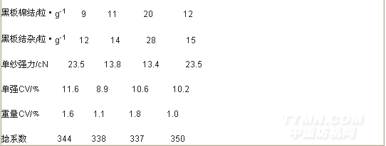 工艺调整后,细纱的各项指标均有好转。适当减小细纱后区牵伸倍数,发挥主牵伸区的作用,有利于提高细纱的条干水平。但如果后区牵伸过小,就会增加主牵伸区的负荷,容易发生“吐硬头”现象,使粗纱不易被牵伸开来。所以在牵伸分配时,应该考虑主牵伸区的牵伸能力,在主牵伸能力允许范围内,适当减小后区牵伸,才能起到降低条干水平的作用。否则,就会适得其反,不仅条干得不到改善,而且还会造成细纱生活不好做。