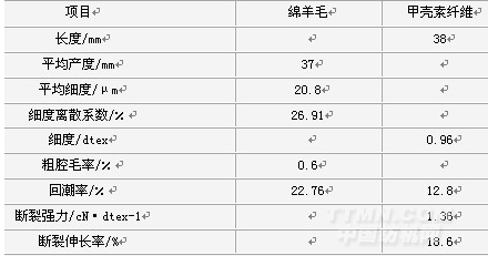 棉纤维的选择,考虑到最终产品主要用于高档服装面料,为了提高可纺性和产品质量,选用优质细绒棉,原棉的品级为2级。棉毛甲壳素纤维混纺抗菌防蛀纱,要求保持棉纱的基本外观和性能,同时赋予更好的弹性和抗菌性能。据资料介绍,在纺织品中甲壳素纤维含量为lO%时就具有抗菌性能,为降低成本,确定其混比为 10%.综合考虑纱线功能、可纺性和产品成本,确定棉、毛、甲壳素三种纤维的混纺比为60∶30∶10,纺纱号数为36.6 tex。各种原料的性能指标如表l所示。