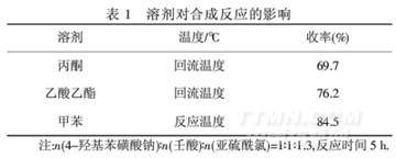 由表1可知,以甲苯为溶剂,目标产物的收率最高.原因是加热时,壬酸溶于甲苯,4-羟基苯磺酸钠在甲苯中有一定溶解性,而目标产物难溶,随着反应过程的不断进行,反应混合物中4-羟基苯磺酸钠逐渐消失,目标产物渐渐析出,有利于反应向正方向进行.因此,选用甲苯为反应溶剂.