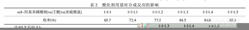 由表3可知,亚硫酰氯用量一定时,增加壬酸的用量,目标产物的收率均有增加,当n(4-羟基苯磺酸钠)∶n(壬酸)=1∶1~1∶1.4时,收率增加不到2%,考虑节省原料等因素,确定n(4-羟基苯磺酸钠)∶n(壬酸)=1∶1为宜.