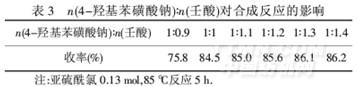 由表4可知,目标产物的收率随着反应温度升高而逐渐提高,超过85℃时,产物收率有下降的趋势.原料4-羟基苯磺酸钠分子中既含有一个磺酸基,又有一个较为活泼的酚羟基,随着反应温度的升高,酚羟基易被氧化,所以在反应过程中温度不宜过高.因此,最佳反应温度为85℃.
