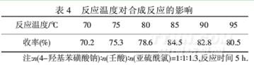 由表5可见,随着反应时间的延长,目标产物的收率随之增加,5 h后,再延长反应时间收率有下降的趋势.原因为酯化反应是可逆反应,反应时间较长时,4-表3 n(4-羟基苯磺酸钠)∶n(壬酸)对合成反应的影响