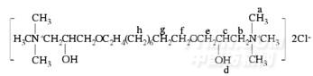 取出一定量中间体放进干燥的三口烧瓶中,加入三甲胺盐酸盐(按1∶2反应)、无水乙醇(50 mL),将反应溶液以33%三甲胺水溶液调节pH至9,40℃搅拌反应3 h.蒸出乙醇和水,得到DCPS2-10粗品,将粗品用石油醚洗涤3次,再用丙酮多次重结晶.最后在真空情况下干燥5 h,得到DCPS2-10较纯品.阳离子Bola型表面活性剂结构式如下: