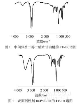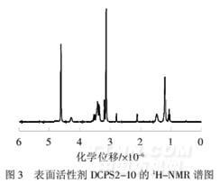 从图3可以看出,3.14×10-6处为季铵盐甲基上氢(a)的信号,3.43×10-6处出现羟基上氢(d)的信号,4.29×10-6处为与羟基相连碳原子上氢(c)的信号,1.21×10-6处出现分子中长碳链亚甲基上氢(h)的信号,1.48×10-6处出现醚键隔一位的亚甲基上氢(g)的信号,在(3.18~3.37)×10-6集中出现了醚键两边和与氮原子相连的亚甲基上氢原子(b、e、f)的信号.