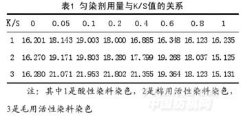 由表1可看出,匀染剂HT15在活性染料染色中对提高染样表观颜色深度(K/S值)具有明显的作用。匀染剂为0.1g/L时染色深度最好,K/S最大。说明匀染剂适量为好,加入太多,会影响上染率,染色深度也会下降。两性匀染剂(T15合成产物)能有效地提高K/S值。