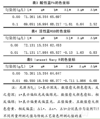 下降有导致色光变浅;这就说明匀染剂HT15可以加深色光,但在生产中要合理安排匀染剂HT15的用量,选择合适的工艺和匀染剂HT15的用量,否则将会导致色光反而下降。通过对上面三组不同染料的对比来看,活性染料效果最好。且毛用活性染料时色光增深效果最好。