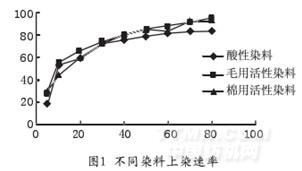 通过试验发现,匀染剂的加入可明显改善匀染性及盖染能力,图中显示酸性染料用匀染剂后和活性染料相比,上染速率都有所降低,但最终的上染速率还是活性优于酸性染料。说明匀染剂适合活性染料,且能代替酸性染料染色。