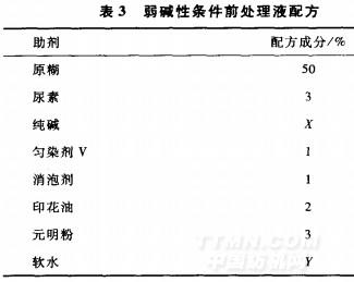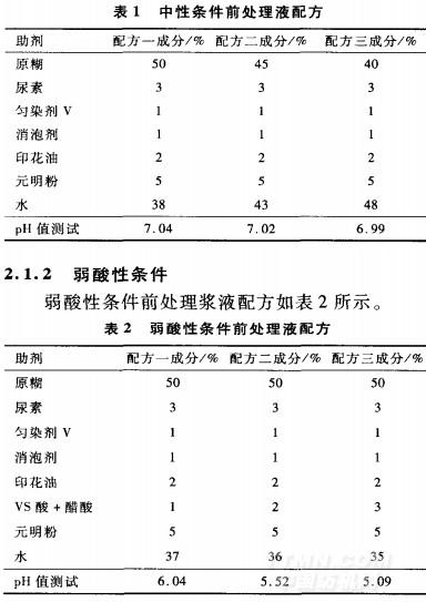 因为强酸强碱会对混纺织物造成损伤,故实验只需在中性、弱酸性和弱碱性条件下配制前处理浆料,分析混纺面料的数码印花效果,优化出合理配方。