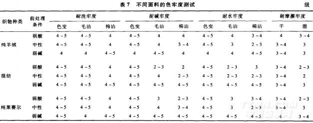 从表7可以看出,综合考虑各种牢度,纯羊绒织物在弱酸性条件下牢度最好,混纺织物在弱碱条件下牢度最好,纯莱赛尔织物在弱碱条件下牢度最好。再次证明前处理pH值为10,呈弱碱条件时,印花效果较理想。