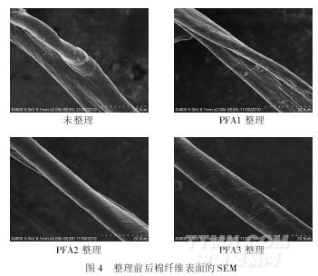 由图4可知,未整理的棉纤维表面比较粗糙,有明显的褶皱.整理后的棉纤维表面变得比较光滑,褶皱弱化甚至完全消失,这是整理后含氟共聚物在棉纤维表面形成一层均匀的薄膜,使棉纤维特有的天然表面形貌被覆盖的缘故.