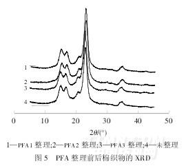 图5表明,整理前后棉纤维的X射线衍射曲线的形状基本相同,衍射峰所对应的衍射角也几乎不变.这说明含氟整理剂整理未导致棉纤维内部聚集态结构发生变化.