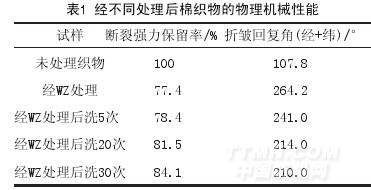 从表中数据可知,经WZ处理后的织物折皱回复角得到了很大提高,说明防皱效果非常好。