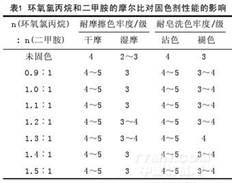 固定二甲胺和二乙烯三胺的摩尔比为1:0.1,改变环氧氯丙烷与二甲胺的摩尔比,合成不同的固色剂,考察两者的摩尔比对织物固色效果的影响,结果如表1所示。
