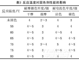 在20~25℃的条件下。当二乙烯三胺滴完后升温至一定的温度反应5h。研究反应温度对固色剂性能的影响,其结果如表3所示。
