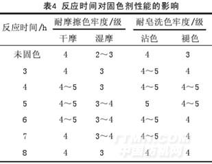 在20~25℃的条件下。当二乙烯三胺滴完后升温至70℃左右,通过改变反应时间来研究其对固色剂性能的影响,其结果如表4所示。