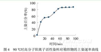 如图4所示,高分子阳离子活性染料在短时间内即可上染纤维.原因是高分子阳离子活性染料的分子质量比较大,与纤维有较大的亲和力,染色时染料分子链与纤维素大分子之间的吸引力较强,而且染料中引入了季铵盐阳离子基团,也增大了染料分子与纤维素纤维负离子之间的静电引力作用,使得染料在低盐情况下也能获得良好的染色效果.