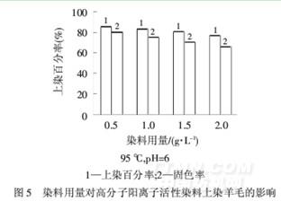 由图5可以看出,上染百分率和固色率随着染液用量的增加而降低,原因是高分子阳离子活性染料分子质量大,难以全部扩散进入纤维内部,高分子链仅很少一部分进入纤维内部,阻碍了染料的进一步扩散.染料用量增大,必然导致羊毛表面的高分子链增加,导致染液中没有上染的高分子链难以进入纤维内部,只能以缠绕的方式与已经上染的分子链胶着在一起,造成上染百分率和染色牢度的降低.染料用量选择1.0g/L比较合适.