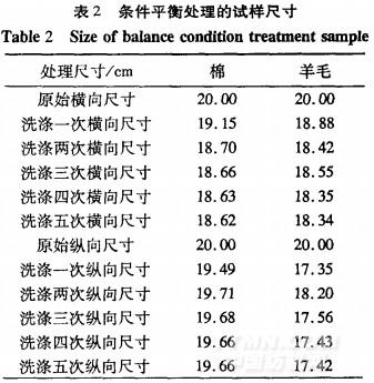 从表2的数据中可以看出,不同原料的纬平针织物经条件平衡处理后的尺寸表现出不同程度的变形。羊毛的缩绒性致使羊毛的缩率明显高于棉,织物条件平衡处理次数对织物的尺寸稳定性有很大的影响。两种材料经条件平衡处理后,在第1次的洗涤松弛中织物纵、横向尺寸变化最大,在随后第2次、第3次的条件平衡处理中织物的尺寸变化较小,到第4次、第5次的条件平衡处理中织物的尺寸逐步趋于稳定。