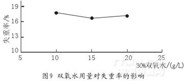 煮练后对提取出的玉米棒包皮纤维进行氧漂,其它因素不改变,仅改变30%双氧水用量,失重率变化结果见图9。