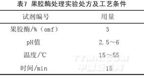 除氧酶处理后的玉米棒包皮纤维,经果胶酶处理实验处方及工艺条件见表7。