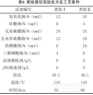综合上所述,煮练的最佳实验处方及工艺条件见表8。