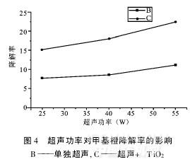 本研究按0.5g/L加入TiO2催化剂配制50mg/L,pH值为3.0的甲基橙溶液800mL,在功率为40W,频率分别为20kHz,25kHz,33kHz和40kHz的超声波辐射下,控制反应温度为20℃左右,催化超声降解60min。实验结果如图3。结果表明,随着超声波频率的增加,甲基橙的降解效果变化平缓,选用25kHz的超声辐射效果略好于其它三种,这可能是由于随着频率升高,声空化过程变得难以发生。因为频率增高,声波膨胀相的时间相应变短,空化核来不及增长到可产生效应的空化泡,或者即便空化泡可以形成,但由于压缩相时间亦短,空化泡可能来不及收缩至发生崩溃。但是由于超声催化TiO2降解有机物的机理还不清楚,因此,超声波频率与TiO2催化性能的关系还难于解释。[8-9]