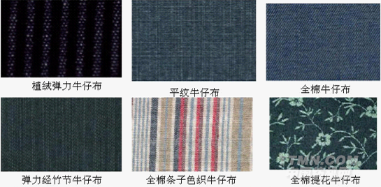牛仔布是以纯棉靛蓝染色的经纱与本色的纬纱,采用三上一下的右斜纹组织交织而成,一般可分为轻型,中型,和重型三类。布的宽度大多在114- 152公分之间。