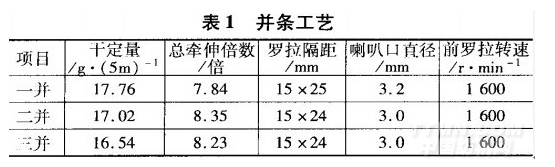 该工序采取“重加压,大隔距,大牵伸”的工艺原则,适当降低车速,防止绢丝、色棉缠绕罗拉胶辊,加压量应适当增加,以保证足够的握持力。适当加大罗拉隔距,相对湿度掌握在65%左右,以减少静电对生产的不良影响。注意纱条通道光洁,喇叭F3直径大小适中,适当加大圈条张力,避免条子挂花、堵塞。由于棉条Il}|含有20%的绢丝纤维,因此在纺纱中静电现象较大,采用经复合涂料处理的中硬度胶辊,能够有效地减少缠绕岁拉胶辊现象发生。并条工序工艺配置如表1。头道为2根色棉条、6根棉绢丝混条并合,二道和三道均为8根并合。