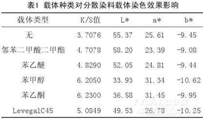 选用邻苯二甲酸二甲酯、苯乙醚、苯甲醇、苯乙酮、Levegal C45作为载体,用分散染料载体法染芳砜纶织物,选定分散红R-5BL3%(omf),载体浓度80ml/L,染色温度110℃,保温时间30min,通过测定芳砜纶纤维染色后表观深度(K/S值)及颜色特征值如表1所示。