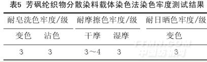 由表5可知,芳砜纶织物采用分散染料载体染色,各项牢度均较好,工艺可行。