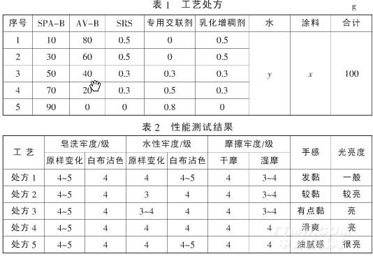 由表2可以看出,处方1处理的织物牢度虽然可以达到要求,但手感特别黏,印花部分重叠黏在一起很难撕开,成本最低(主要以SPA-B为主,其用量越少,成本越低)。而处方5处理的织物虽然牢度最好,亮度也是最好,手感稍硬不够干爽,有油腻腻的感觉,但成本最高。处方2处理的织物手感较硬、发黏,水洗原样变化差,成本较低。处方3处理的织物的牢度都基本可以达到要求,手感较柔软,光亮度也很好,但还是有些发黏,成本较低。处方4处理织物的手感最好,柔软、滑爽,光亮度也很好,牢度基本达到要求。因此,确定采用处方4工艺。