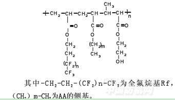 由表1可知通常纤维组成的织物都不具有防水效果,因为纤维的临界表面张力大,并且有些纤维亲水性强。全氟辛基丙烯酸乙酯与其他单体的共聚物的临界表面张力很小,并且具有疏水性,因此防水效果很好。若全氟辛基丙烯酸乙酯与其他单体的共聚物在织物上成膜,则织物不仅能防水,而且能防污、防油。由于聚合物的主链为碳碳单键,因此共聚物中全氟烷基或者其他基团可以在109°28′绕碳碳单键自由内旋转,呈现出多种构象。在空气的低表面能环境的诱导下,全氟烷基交换到表面,高分子链和其他基团回缩到内部,呈现特定的构象。聚合物在织物表面成膜后,全氟烷基处在织物的表面,由于全氟烷基间内聚能低,因此织物的表面张力低,污垢不易沾染或已沾染的污垢很容易从织物上去除,从而使织物具有防污性能。