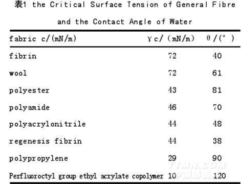 在20℃时,水的表面张力为72.8 mN/m,油的表面张力为20~40 mN/m,其他液体污垢的表面张力一般介于水的表面张力和油的表面张力之间,织物防水、防油、防污要求织物的表面张力分别比他们的表面张力小。现以水为对象,探讨水与织物接触的表面现象。织物的防水性以接触角θ﹥90°为准,接触角θ越大,防水效果越好。