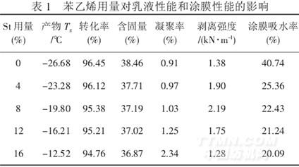 从表1 可见,调节苯乙烯单体用量,可获得不同Tg的共聚物.随着苯乙烯用量的增加,乳液的转化率和含固量降低,凝聚率增大,原因是苯乙烯和丙烯酸酯类单体的相容性较差,从而影响了单体转化率和乳液稳定性.[7]随着苯乙烯用量的增大,涂膜吸水率降低,原因是苯乙烯的刚性较大,润湿性能较弱.当苯乙烯用量为8%(对单体总质量)时,剥离强度出现极大值,原因是当苯乙烯用量超过一定量,随着聚合物分子链中苯环的增多,极性变弱,附着力降低,对织物表面润湿性差,无法良好粘接,剥离强度降低.综合考虑,选择苯乙烯用量为8%(对单体总质量).