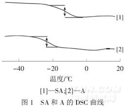 测得含8%(对单体总质量)St 改性丙烯酸酯类共聚物(SA)和不含St 的纯丙烯酸酯类共聚物(A)的DSC曲线如图1 所示.