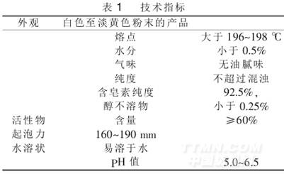 我国对茶皂素的研究,从起步就以应用为目的,茶皂素广泛地应用于各个领域,全国每年有75 万t 茶籽饼粕的资源量,国内资源的利用率仅为10%,用于生产茶皂素,年处理茶籽饼2600 t,总投资55 万元,产茶皂素260 t,可年获利390万元,利税70 万元。采用生物技术和后处理膜分离技术提取茶皂素,产品纯度在97%以上。