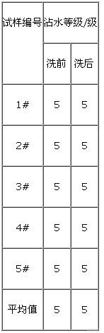 在日常检测中,对织物的拒水级别测试,一般用淋水性能测试方法。按照GB/T4745—1997《纺织织物表面抗湿性测定沾水压试验》中要求的取样、操作程序、评定进行,织物的经向与水流方向平行,分别测试洗前、洗后试样的拒水级别,结果见表2。