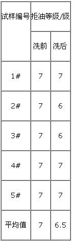 拒油等级测试采用GB/T19977—2005《纺织品 拒油性 抗碳氢化合物试验》标准中方法。首先是用最低编号的实验液体,以0.05 mL液体小心滴于织物上,如果在30 s内无渗透和润湿现象发生,则紧接着用较高编号的实验液体滴于织物上。实验连续进行,直至实验液体在30 s内润湿液滴下方和周围的织物为止。织物的拒油等级以30 s内不能润湿织物的最高编号的实验液体表示。