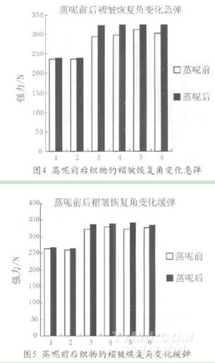 按照上述蒸呢工艺条件对织物进行蒸呢处理,蒸呢前后织物的褶皱恢复性能变化如下图: