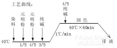 工艺流程:进水→染料→元明粉→纯碱→循环固色→水洗→皂洗→热洗→冷洗→柔软处理。
