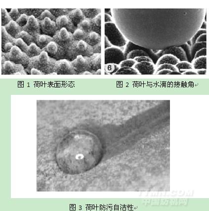 防污自洁膜材就是膜材表面沾上灰尘或其它污物后可以被雨水冲刷或风力带走而无需洗涤,这种自清洁的功能是德国Barthlott 教授及其同事通过观察荷叶表面的微观结构而得出的,他们认为这种自洁性能是由荷叶粗糙表面上微米结构的乳突以及纳米结构的蜡晶的存在共同引起的,并将此现象命名为荷叶效应(Lotus-Effect)[1],如图1~3所示。随着人们环保意识的增强,对于这种具有自清洁功能的膜材的研究将会备受关注。