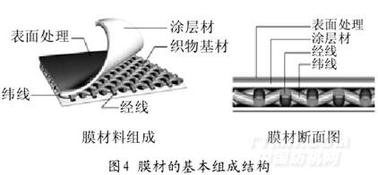 建筑膜材一般采用纺织品为基材,施以防水涂层剂并对涂层表面进行功能化处理而制成[3-5]。其结构组合为:织物基材层、高分子功能涂层和表层,如图4所示。