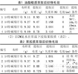(1)将碱缩后的棉针织汗布,通过索氏抽取器以乙醚萃取其油脂蜡质,结果见表1。