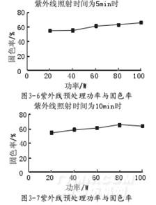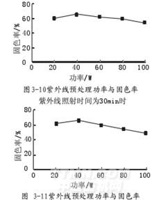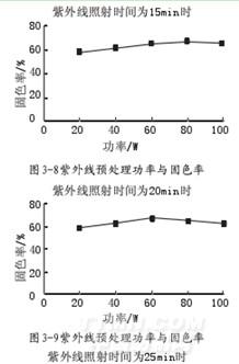 由图3-6到图3-11可见,不同的紫外线功率预处理时间对上染率提高的规律不同,也有一个明显的峰值。随着处理功率的增大,上染率有下降趋势时间越长这种趋势越明显。原因功率过高,辐射能中高能活性粒子数量增多和能量增大,纤维素被氧化的程度越激烈,降低对染料的吸附能力[4-5],导致上染率达到峰值后开始回落。